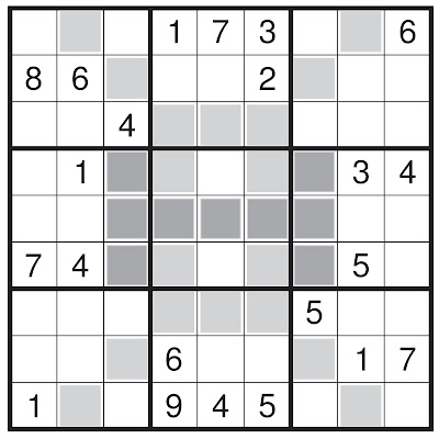 Rules: Place a digit from 1 to 9 into each of the empty cells so that each digit appears exactly once in each row, column and 3x3 outlined box.Additionally ,Each group of nine coloured cells must also contain the numbers 1 to 9